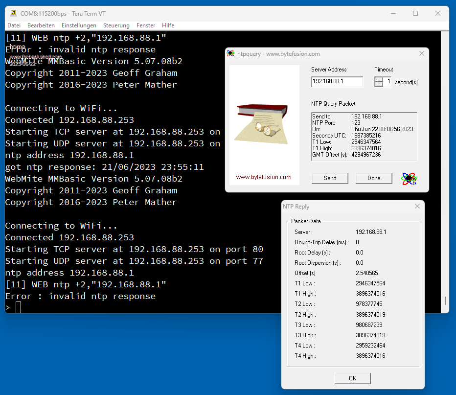 NTP server on a MikroTik router with a WebMite causes problems. If the AP has no internet (but the time and internal clock are correct!), the NTP query does not work with the WebMite.