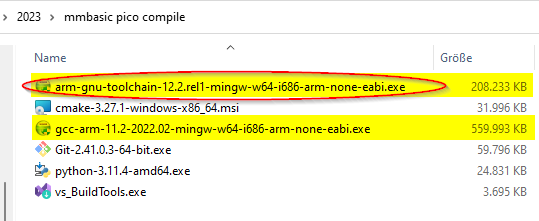 ![]() https://datasheets.raspberrypi.com/pico/getting-started-with-pico.pdf 9.2.2. Alternative manual installation WARNING Manual installation of the toolchain under MS Windows is complicated and not recommended. To build you will need to install some extra tools. • Arm GNU Toolchain (you need the filename ending with -arm-none-eabi.exe) • CMake • Build Tools for Visual Studio 2022 • Python 3.10 • Git Download the executable installer for each of these from the links above, and then carefully follow the instructions in the following sections to install all five packages on to your Windows computer. https://developer.arm.com/-/media/Files/downloads/gnu/12.2.rel1/binrel/arm-gnu-toolchain-12.2.rel1-mingw-w64-i686-arm-none-eabi.exe?rev=4eb1b321a6f44ca78be67eb9cef8b37a&hash=AD35FDA3E92F4D716B9C4FCF21A9B27F ~ 208 MB https://github.com/Kitware/CMake/releases/download/v3.27.1/cmake-3.27.1-windows-x86_64.msi ~ 32 MB https://aka.ms/vs/17/release/vs_BuildTools.exe ~ 3,7 MB https://www.python.org/downloads/release/python-3114/ (https://www.python.org/ftp/python/3.11.4/python-3.11.4-amd64.exe) ~ 25 MB https://github.com/git-for-windows/git/releases/download/v2.41.0.windows.3/Git-2.41.0.3-64-bit.exe ~ 60 MB I need help once again! Is this really the right compiler version? Only 208MB compared to the old version with 560MB? |