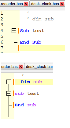 That is a strange one Bill. Is it only one program that does it? Start a new program ![]() The top half is correct. Then remove the rem from the dim line and 'format' The second part of the image has the 'sub' highlighted as a user variable. Ignore the orange line to the left - that's a new feature in the next release. I expect that there might be (or was) a variable named 'sub' You have to find it then close the program and reload to cleanse the user variable list. The easiest way to find all 'sub' words is to highlight the word then F11 for a list of lines involved. You can try the attached mmedit5.exe but I don't think the problem is in MMEdit (but I have been wrong before) MMEdit.zip Jim ' ' dim sub sub test END sub IF sub = 1 THEN PRINT "???" ELSE PRINT "Silly" IF sub = 0 THEN PRINT "???" ELSE PRINT "Silly" Strange things are possible. Edited 2024-02-13 17:03 by TassyJim VK7JH MMedit |