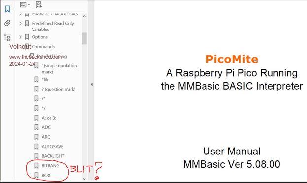 Geoff, Very minor issue. In the picomite manual. BLIT command is explained in the COMMAND section in the table. If you view the booksmarks (unfold the list) all commands are shown, except BLIT. Some attribute is missing. Volhout Edited 2024-01-24 21:09 by Volhout PicomiteVGA PETSCII ROBOTS |