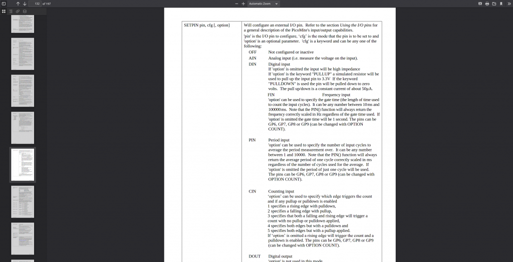 Geoff re: above The command SETPIN FIN is missing from the PicoMite and PicoMiteVGA manuals. It is there in the WebMite manual. |