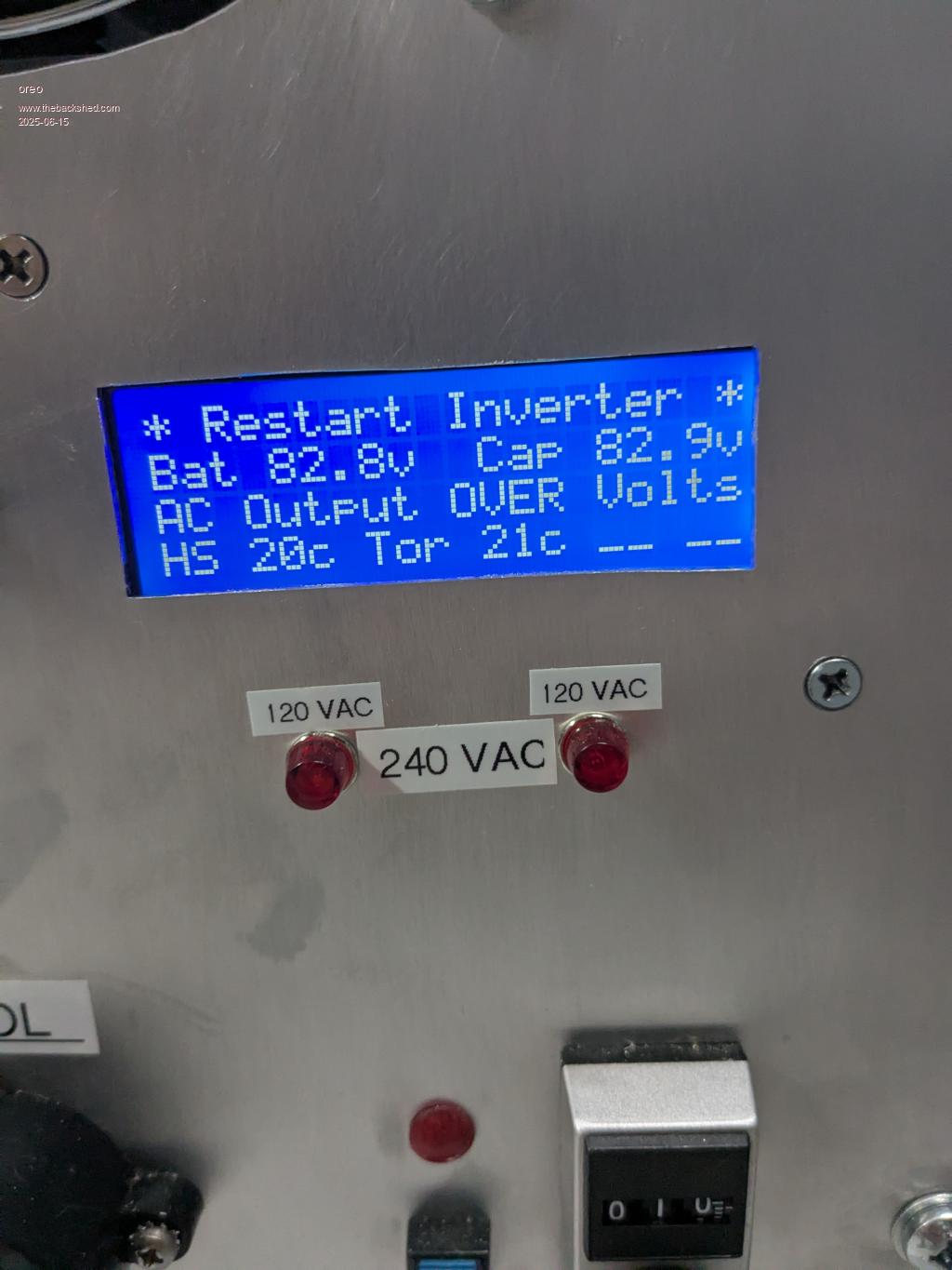 So the Wiseguy inverter has been running reliably for about 7 weeks, and I have been slowly dialing in the 60Hz frequency. I have the software at 60+ and external clocks that use the line frequency are losing ~17 seconds per day. This is pretty good, but I would like to improve it if possible. FYI, I measured the frequency of the 3 Nano processors I have and they vary significantly (from 15.860-15.947mHz). Anyway, yesterday I noticed the inverter was not running and was displaying this message. ![]() I shut off and restarted the inverter, and it started and settled back to 240vac. I left it and when I returned an hour later, it had tripped again. Further attempts to restart the inverter resulted in it immediately tripping with AC output overvoltage. So I monitored the voltage on pin A0 of the Nano. With a separate 120v source plugged into J2, I measure 1.4 volts on A0 and the display reads 120VAC. This is what it should be I think. When I reconnect J2 back to the output of the inverter and turn it on, the voltage on A0 ramps up to 3.0v. I tried increasing the over voltage trip to 280v, and it still tripped. The display briefly displayed 290vac during the attempted power up. Since the voltage being fed into the Nano on pins A0 and A5 looks to be correct, I figured there must be a problem with the Nano itself. I swapped it out with another, and after getting the new Nano set up, it does the exact same thing. The 5v power supply measures 5.03v and the 12v supply looks good too. The output of the inverter when in test mode is a perfect looking sine wave. Any suggestions on what to check next? I do have a spare board, which needs just a few components so I will build that up and swap it. (probably tomorrow) Right now for grounding, I have the .01uf Capacitor in place (near the LR mounting screw), and have the cast heat sink directly under the board. I believe the preferred method would be to have an additional isolated plate under the Nano, which is attached to the .01uF capacitor. I will try this first. thanks Greg |