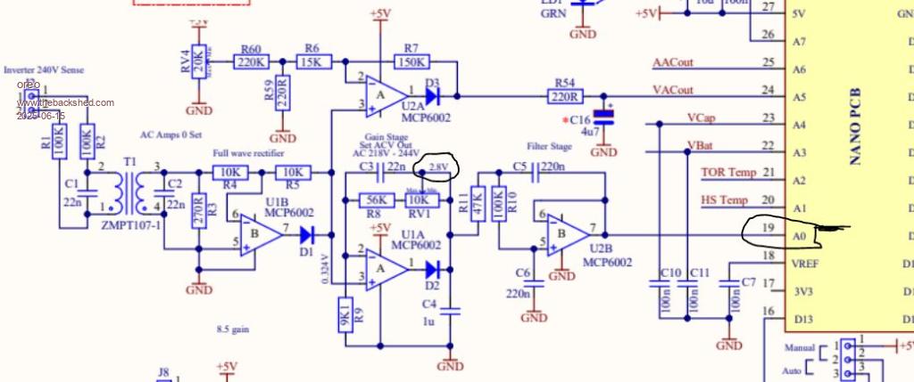 Hi Greg, I have essentially zero experience with the KeepIS software so my comments are only general in nature. From memory I think the control feedback voltage on A0 should be ~ 2.8VDC when the inverter is in regulation, you mentioned it goes to 3V? When checking the A0 voltage only measure it on the Nano module itself, in case the Nano module pin/socket to the controller PCB is not mating properly. I note that at 120V you measured 1.4V so at 240 it should be 2.8V, which is where it should regulate, increasing A0 past 2.8 should reduce the PWM to minimum. The fact the output regulated to 240V ok after a restart before tripping again later sounds like an intermittent fault so check all AC voltage feedback connections, J2 plug integrity etc. It could even be a poor soldered joint on the controller PCB along the J2 to A0 chain. If you have made any tweaks to the software, can you revert back to the original software from KeepIS to see if that cures it, but it sounds more hardware than software! I assume the overvoltage monitor and shutdown is derived from a setpoint on A5? Everything happens for a reason - keep hunting, the cause will eventually be revealed. Good luck! Edited 2025-06-16 01:56 by wiseguy If at first you dont succeed, I suggest you avoid sky diving.... Cheers Mike |