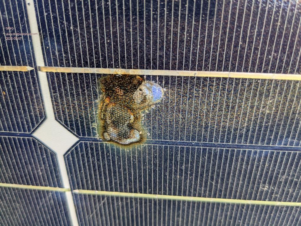 So I finally got around to installing the last 3pcs of the 535w panels I purchased in February last year. For the last year or so, I have been using 3pcs of 535w and 3pcs of old 250w units. Anyway, when I removed the 3 older panels I noticed a burn mark on one of them. ![]() Looking from the bottom ![]() It seems like an odd location for a burn, as I would have thought that it would center on a bad metallic track. This burn looks to be centered in the solar cell array itself. Is this type of thing common? At least the replacement panels are bifacial which means there is glass on both sides of the panel. Greg |
