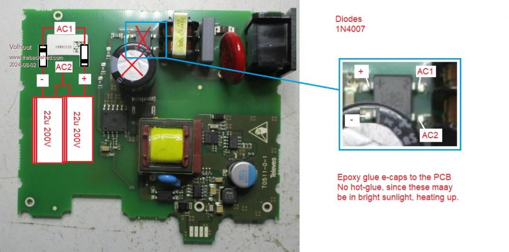 This would suffice to run the PSU from 50Vac... ![]() You could even leave the E-cap on the board, just add 2x E-cap and 2x diode, and replace the bridge rectifier. Since the ripple in a voltage doubler results in half 2x half rectification, the ripple changes from 100Hz to 50Hz. Meaning that leaving the original e-cap on the board may be very useful. After breadboard testing it, you can also make a PCB that holds the voltage doubler, and leave a more professional impression to the customers. Volhout Edited 2024-08-02 17:20 by Volhout PicomiteVGA PETSCII ROBOTS |