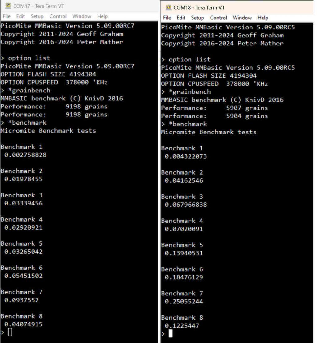 The difference between BM4 and BM5 is that BM5 has a GOSUB The RP2040 takes an extra 69µsec for this, whereas the RP2350 takes only <3.5µsec Actual MMBasic code gets more than a 1.7 X boost in performance Exciting stuff |