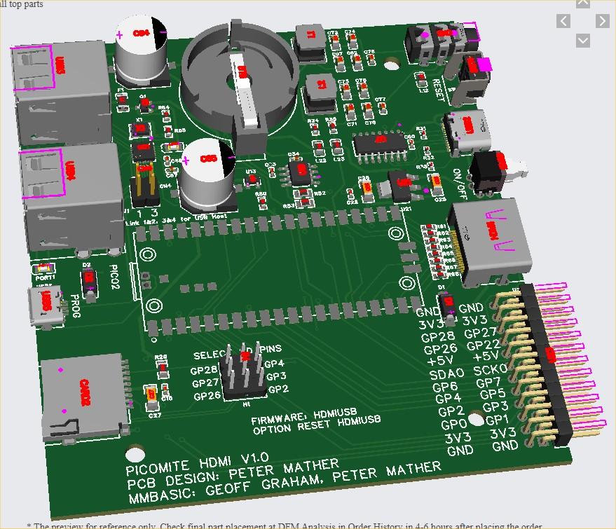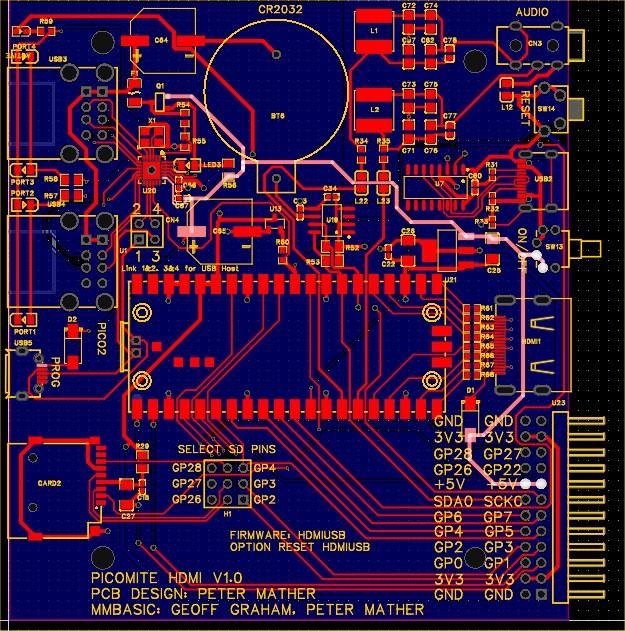 Is it possible to move the Pico2 module closer to the front edge of the board, so as not to make an extra USB connector for flashing the Pico2? By the way, you can combine the HDMI landing site with the VGA, or place it next to the HDMI and get a universal PicoMite HDMI/VGA board. In this case, the expansion port should be placed on the side!? Parallel connection of these two video outputs with their resistances to Pico does not interfere with each other in operation, this has already been verified on other projects and there is even the possibility of auto detection of which interface is currently connected. Edited 2024-09-15 22:02 by javavi |