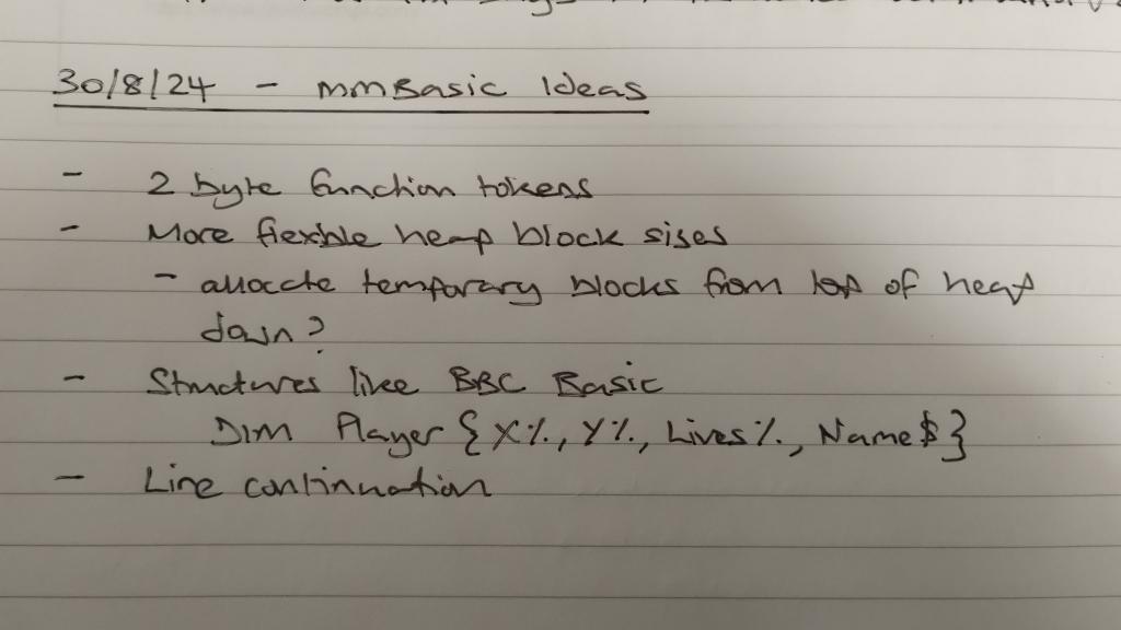 Not yet. I want to throw v0.7 over the fence and put out any resulting fires first. However it is at the top of the list for v0.8+: ![]() Incidentally when I speculated a couple of months back during one of your "quiet" periods, I thought this might be what you were working on ... I guess I was wrong . If you do get bored waiting for me and start tackling it yourself I'd appreciate a heads-up to avoid duplication of effort.Best wishes, Tom Edited 2024-09-14 23:58 by thwill MMBasic for Linux, Game*Mite, CMM2 Welcome Tape, Creaky old text adventures |