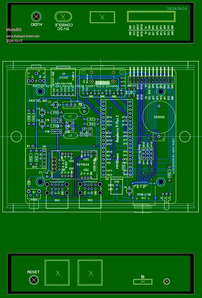 Yes, it can be done as a through-hole, with compatibility (more or less. I took liberties with the HDMI.) I've not completed this yet, hence the silly component numbers & stuff. It looks promising at this stage though. I've attempted to keep to Peter's layout, but decided to swap the audio jack and reset button as I probably press the reset button more than I mess with the audio jack! The Adafruit DVI breakout module isn't particularly easy to find, but it would be easy enough to do a version with a SMD HDMI socket and resistors. As I'm a cheapskate there are less LEDs. The audio output has DC blocking though as it's powerful enough to drive sensitive headphones. The Pico2 has one of those "mini plugs" with just D+ and D- on it You need 2 USB ;eads for programming. One provides the power and the other (plugged into the Pico) the data. It won't work with just one because the switcher supply is disabled. The Heartbeat LED output on TP5 can be connected to either the GPIO port or the red section of the front panel LED, which then replaces the on-board one. With the green section on the 3V3 supply if flashes green/sort-of-yellowish. A 3mm red/blue one might be nice if you can find one. Mick Zilog Inside! nascom.info for Nascom & Gemini Preliminary MMBasic docs & my PCB designs |