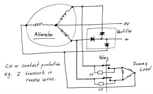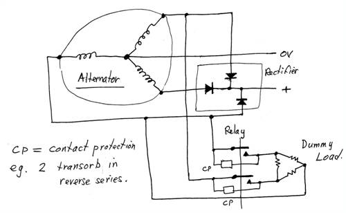 Glenn, It seems a pity to load both the battery & the generator. This is a waste of energy. You said above, that my suggestion re inserting a diode is undesirable as it would drop the voltage. Here are 2 suggestions:- 2. Have you considered using a Schottky diode? As you know, they have a lower voltage drop than silicon ones. If necessary, you could connect several (Schottky's) in parallel to reduce the voltage drop. 2. The alternator has a 3 phase rectifier. So if the anodes of these diode are accessable, then you could connect the load resistors as shown in the drawing & thus a diode would not be necessary & thus there would be no additional voltage drop & the battery would not be discharging into the dummy load. Moreover, the resistors will dissipate less power & thus can be of a lower power rating than otherwise. Len