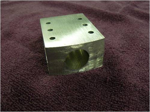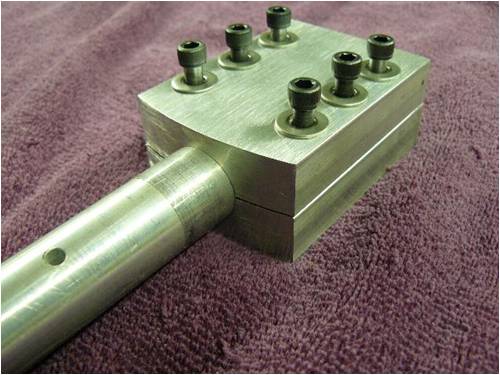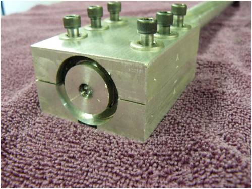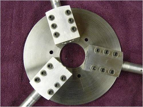 I used 6061-T6 extruded alum rectangle stock to machine three mounting blocks to mount the alum rods to the steel hub plate. Using six ¼ 28 socket head cap screws per mounting block to secure both the blocks and rods to the hub plate gave me plenty of pressure to keep things nice and tight. Maintaining a gap of approximately 20 thousands of an inch between the upper and lower extrude-ions applies a spring pressure (if you will) on the rods to eliminate the cap screws loosening from vibration.