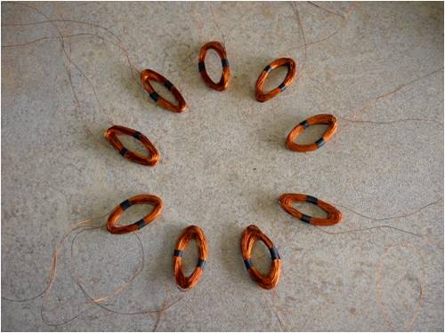 Here's one completed coil. Note the size; it's tiny. Nine of these little