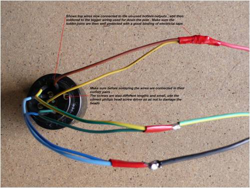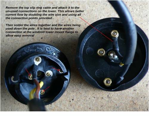 The wire comes up inside the mast and I clamped the mast wire inside the adapter flange, and terminated with a multi wire connector the same as the one in the stator, this allows the head to be disconnected without disturbing the wiring. From this terminal there are two wires per phase going to the underside of the wire slip ring assembly. The next photos are from Phills photo file, Thanks Phill. I used spade terminal for the connectors as they are more substantial than a conventional connector, and they fitted in very nicely with a small trim on the edges to fit them in the slots, on the bottom there are two connectors per slip ring as the connection screws are small it allows two paths for the current from the slip ring. The upper connections use a spade terminal but with a yellow sleeve as this takes the 3mm wire coming from the alternator.