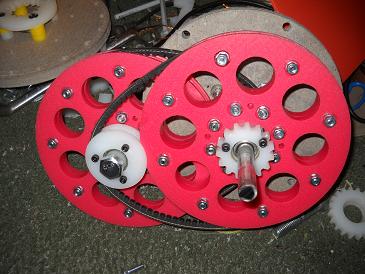 Greetings, the 3/8 timing belt is just to small for the intended application. Even under tension the belts would skip the pulleys at higher RPM’s. I was able to find larger tooth V belts at the local auto parts store. They are a larger diameter with larger teeth. This should resolve the problem. I have to fabricate new pulley. Enjoy the day.