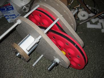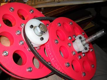 Timing belts and pulleys are installed on a test rig. Because the pulleys are made using two pieces I was able to bevel each piece toward the center of the pulley. This forces the belts to track toward the center of the pulley so a lip is not required. I have to find the correct tool to bend the spring into the correct shape. This a first attempt but it appears to be working. The spring pulls on the top and bottom of the movable shaft and all belts have tension. Again this is a experiment and a learning experience, I do not know how long the belts will last. The next step is to mount it on the PMA and perform a road test. The current configuration is a 1 : 6 ratio.