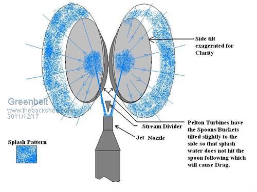 FROM PAGE 4, Posted: 14 December 2011 at 6:25am | IP Logged Report Post Quote Hydro John Hello Friends, Greenbelt wrote: The Jet stream from the Nozzle may need to be a bit lower down ( nearer to a tangent to the turbine cups) maybe down 3/8", I say this because I have read various documents about the design of Pelton wheels and the principal of energy transfer from water to wheel, Hydro John, Wrote; ( I have tried many different positions and the one pictured below seems to give the best results.) It is possibly causing some Drag when it is lowered because the splash water at 180 Deg. return may be hitting the Bucket behind it tending to slow it. Not Picking your work apart you are already showing positive results, just passing a few things on that I've picked up over a long time. This drawing will show how this problem was solved by others who Worked on these things. --------- Cheers, Roe Time has proven that I am blind to the Obvious, some of the above may be True? |