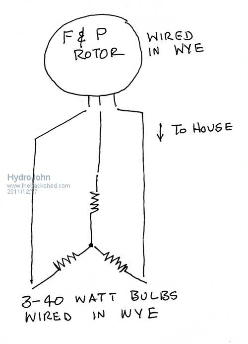 Hello Friends, [quote=Warpspeed]I assumed you were feeding three phases down three wires to your home, as that is the most efficient method of transmission, and measuring phase to phase, as there will be no neutral wire with this delta connection.[/quote] Just so I understand everything, I am sending a diagram of the way I have the wires connected to the 3 -40 watt bulbs. I think they are connected in Wye and not delta. I'm not sure if I have things hooked up right, but I think so. Also a picture of my unaltered 60 F&P rotor. There are 36 coils total with 12 in each phase. I think the 12 coils in each phase are connected in series and it looks like one terminal of each phase is connected to a common point and the other end of each phase exits the rotor to my house. Would this mean that the rotor is wired in Wye? The voltage reading I took was across 2 of the wires coming out of the rotor and not across the 40 watt bulbs.