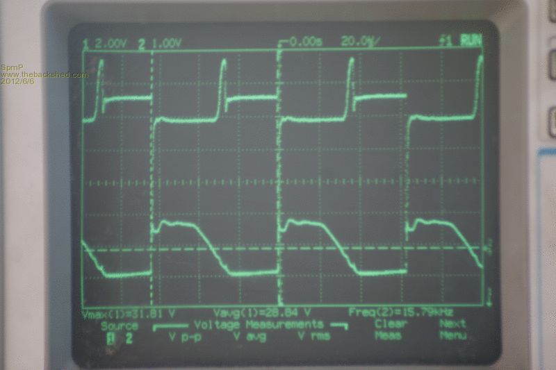 The upper trace is the voltage across the battery, sorry its a bit shakey, Vmax=31.81 Vav=28.84 F=15.78kHz, DeltaV~0.5V (I will change the hysteresis resistor to 660K and see what that does later on). Charge current 5.75A. The lower trace is Vgs for the FET.