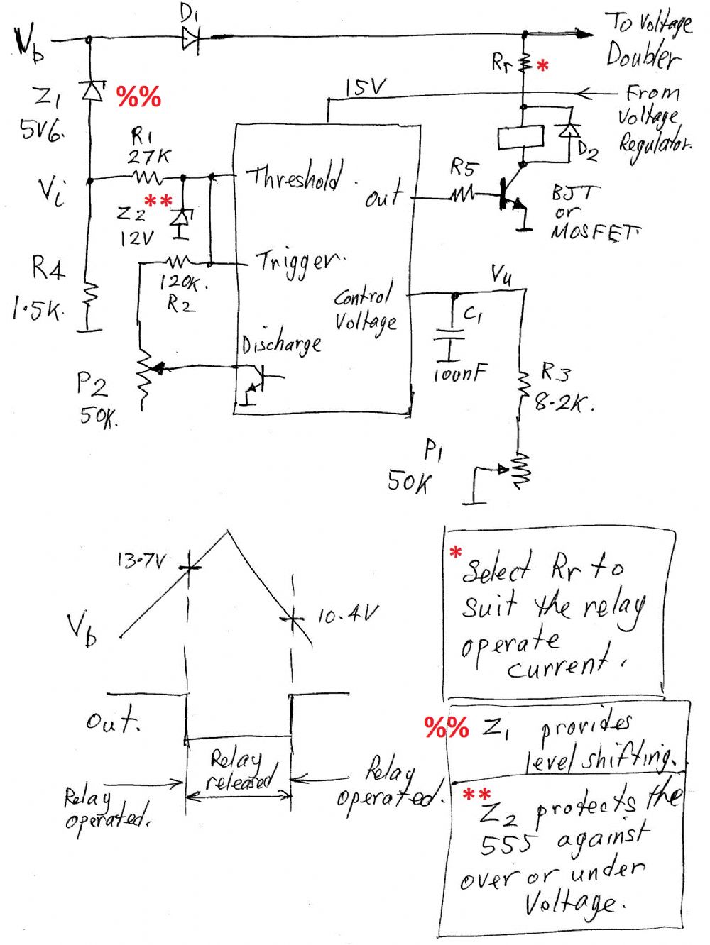 Jasper, Here is how I would do the relay case using a 555. The Shunt case would be a variant - of course. I have assumed the use of a voltage doubler and a regulator to provide 15 volt for the 555. However, it could be configured to operate with a supply of 7.5 volt if you wish - but I don't recommend it as the low voltage complicates the issues - particularily for the Shunt Case. Adjustment procedure:- 1. Leave Vb open initially. 2. Set P2 to its maximum resistance. 3. Set the control voltage Vu to about 9.7 Volt. 4. Connect Vb to a 13.7 volt source. 5. Adjust P1 (reducing Vu) until the 555 output goes low. 6. Reduce the voltage at Vb to 10.4 volt (the 555 output should remain low) 7. Adjust P2 until the output goes high. Note that P1 should be adjusted first since it sets both the upper and lower thresholds inside the 555. I’ll post a low pass filter for you tomorrow. Len