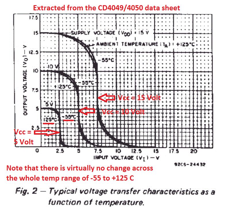 Jasper, The graph below is from the CMOS CD4049/4050 data sheet. It shows that the CMOS transfer function has virtually no variation with temp. This is the reason why I started (some days ago) to consider the CMOS options. The "threshold" is at approx Vcc/2 where the temp effect is close to or = 0. Len