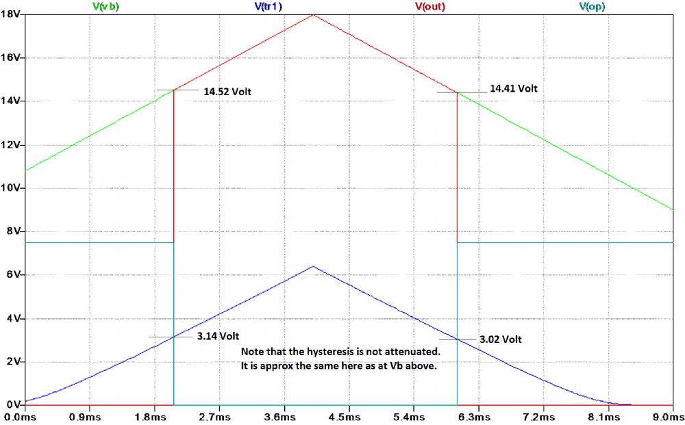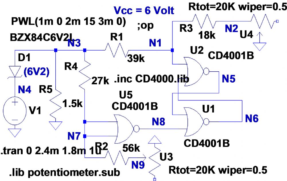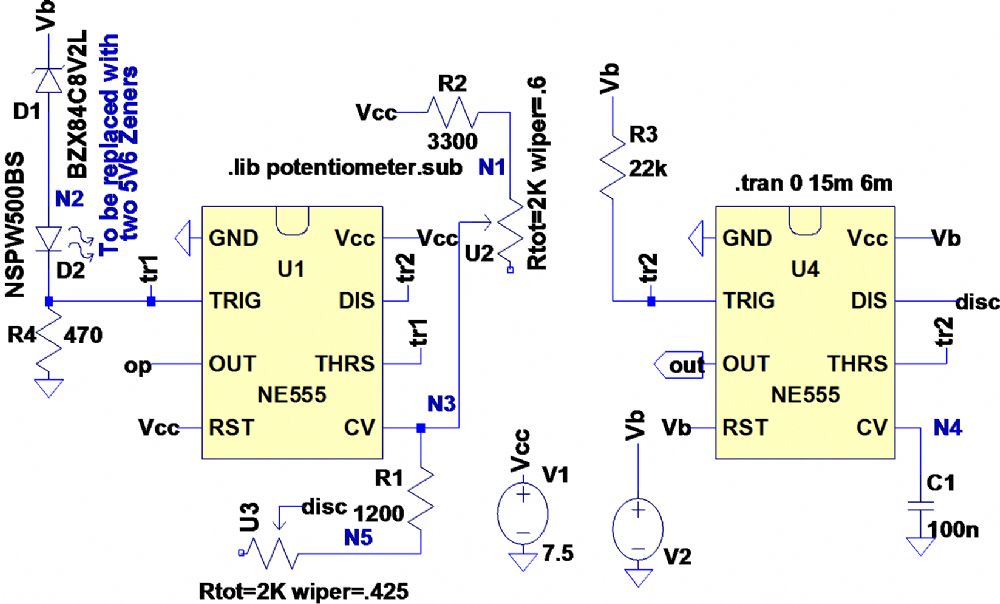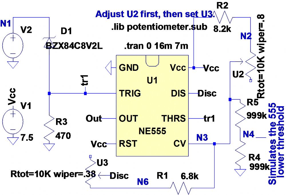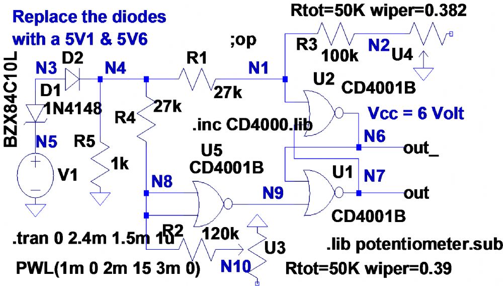 Jasper, I had another look at your circuit shown in 555-Schmitt-trigger_Shunt-Case.asc. It was a good idea to use a Zener diode as you did, however it suffers from three disadvantages:- 1. 3V3 Zener diodes have a significant temperature coefficient and abroad “knee”. 2. The pots attenuate the signal and thus reduce the hysteresis presented to the 555. However, it inspired me to think of a 555 solution that does not require attenuation of the signal and should have minimal thermal characteristics. So I’ll post the simulation tomorrow. Len |