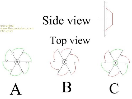 Oh that is very bad after so much work. Perhaps electrically loading up the turbine to limit the voltage may not be the best approach with this. Braking the rotor electrically will massively increase the wind loading on the whole machine. Would it be possible to furl the blades by spilling air once the machine reaches some maximum speed and output voltage ? If the blades could close right up against each other, the wind would then effectively blow around a smooth cylinder with no turning at all. No need to go that far, but it should be possible to limit the maximum speed by controlling airflow. Perhaps some centrifugal weights and springs could be arranged to tilt the blades to reduce the open area caught by the wind on the up wind side. I would think the pitch of all the blades would need to be linked together, to prevent the whole thing wobbling or going out of aerodynamic balance, and to prevent cyclic blade flutter. Another way might be a small dc motor with a very large reduction gearbox to mechanically adjust the pitch of all the blades together. The output voltage could probably then be kept reasonably constant, or at least limited to some safe maximum. A small scale model may be a simple way of trying a few different ideas. Something you could hold outside the window of a car driven at various speeds. Cheers, Tony. |