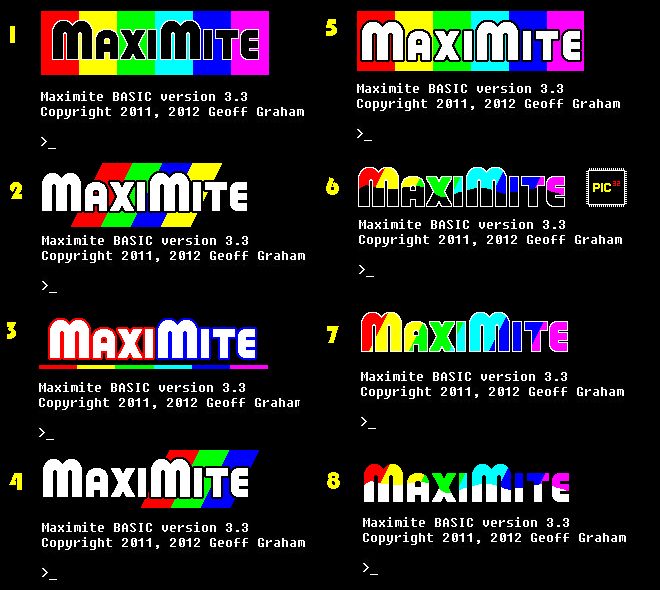 This is my latest collection of possible startup logos for the Maximite. The small graphic of the Pic32 after Logo#6 can be placed on any of the logos but I'm thinking that maybe be should just keep it simple and leave out the extra graphic. My personal favourite is #5. It's very clear and highlights colour.