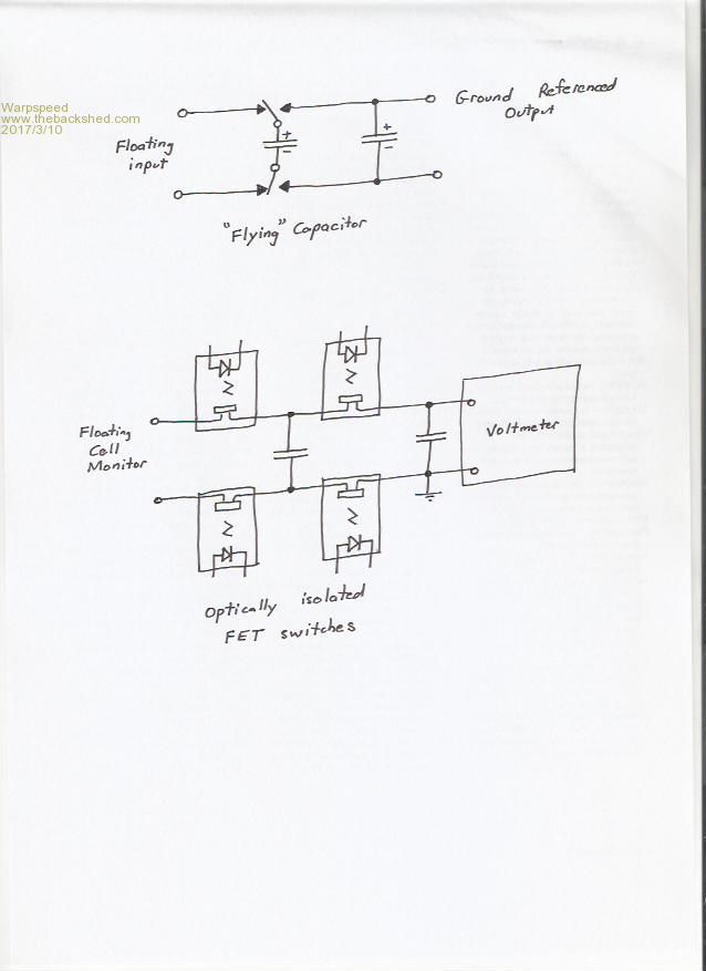 The concept is to switch a capacitor directly across each battery cell so it charges to the exact cell voltage. Then disconnect it from the cell and connect it directly to a ground referenced voltmeter. By switching back and forth both capacitors rapidly assume full cell voltage with minimal error. Relay contacts could in theory be used to do this, but a much nicer solution, that is not going to mechanically fall apart would be some fully isolated optically driven fet switches.