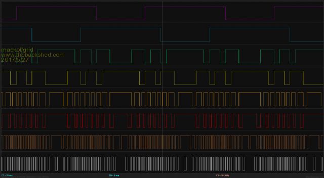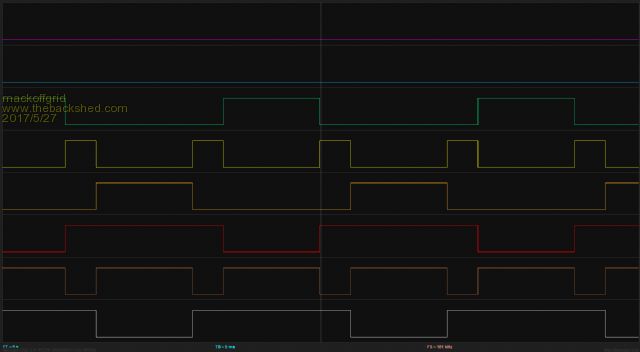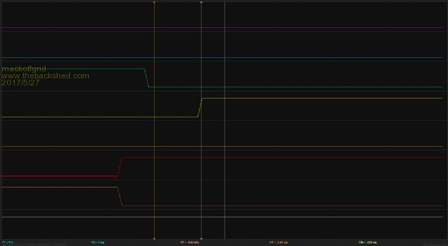 I have been testing the Clock brd this week and all is going well. ![]() The Connector at the Top Left and the missing ic are part of the uProcessor brd control and is not needed to test the clock board and basic inverting. Next is the Logic capture of D0 to D7 out of the eprom/574 ![]() At this point the signal is active Low. D0+D1 drives the smallest transformer and so on. Next shows the signals for just one transformer (Large Transformer) in more detail. From the Bottom, D6 then NAND (D6,D7) , then D7 , then the same three signals after a delay and after been inverted by an ICL7667. At this point the signals are Active High. The Nand of D6 & D7 is the clamp signal. ![]() The next image shows the delay (looking at the Clamp signal going active high. ![]() Tony, the dead time measures around 1uSec - I'm considering changing the 3k to 10k to expand the dead time. |