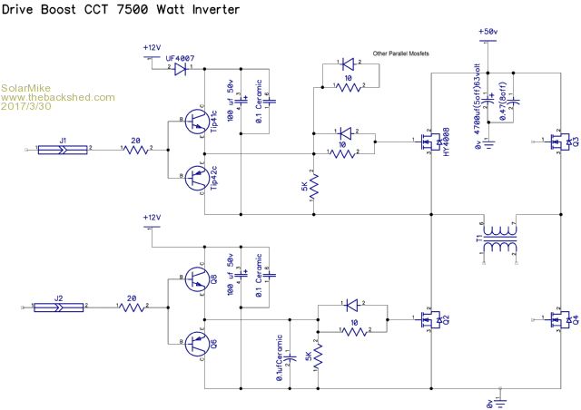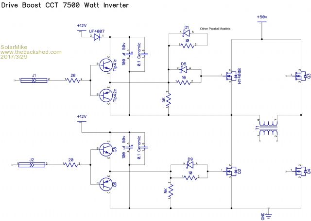 I traced out part of the IR2110 boost circuit for the 7500 watt inverter, the boost drivers are Tip41\42C emitter follower pair, each pair driving 5 x HY4008 parallel mosfets in one leg of the H-Bridge. No gate to source resistors are used here, just the single 5K resistor as shown. The bootstrap diode UF4007 charges the upper bias caps to 12 volts when the lower mosfet turns on. ![]() Cheers Mike |