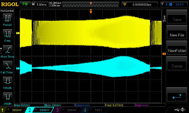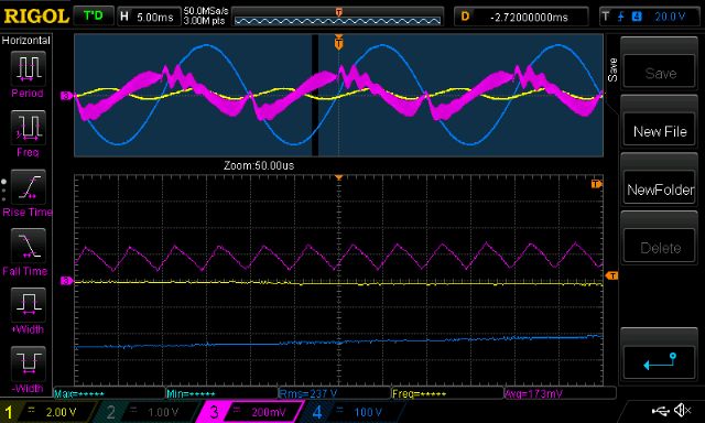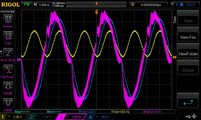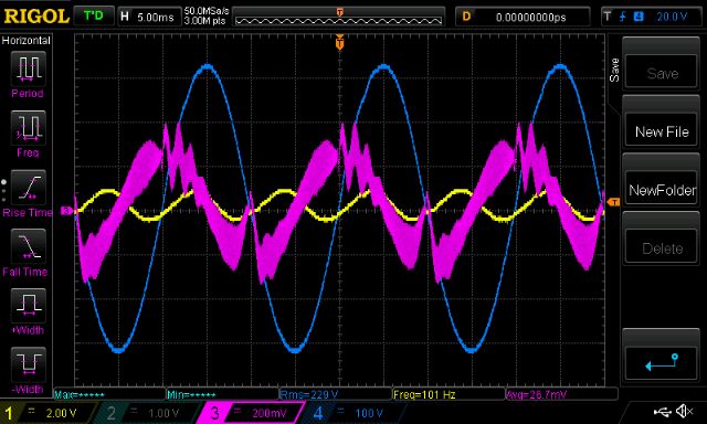 Part 6 - transformer resonance and a look at primary winding current After reading Warpspeed’s post on transformer resonance I thought I wanted to see it. So, the experiment is set up using - a sig gen with it’s output configured to drive 50 ohm output - a 47R resistor, insures with the transformer winding under test. - one DSO channel looking at sig gen voltage output - other channel looking at transformer winding voltage - sweep sine wave from low to high, with a sort of constant amplitude. Transformer self resonance can be viewed as a LC tank. Resonant frequency (Hz) = 1/( 2 x pi x sqrt(L.C) ) I use the 1000VA Aerosharp toroid, 25 turns primary. I use the factory wound 240V secondary winding. I’m lucky to have a BK Precision 879B LCR meter which lets me measure at 100, 1K and 10KHz. At 100Hz, the primary is 10.6mH with Secondary open, when secondary shorted, the primary becomes 10uH. This 10uH is the leakage inductance. This is not very much at all. first is 20 - 20KHz sweep, 1v p/p ,2KHz/div horizontal scale yellow is sig gen output, light blue is primary winding voltage 0.97uF cap across secondary ![]() Next shows when secondary is open Note resonance, peak around 4Khz ![]() This has the secondary connected to a small 75 VA 240V->25V toroid, into the 240V winding. Still has the resonance, same peak location. It’s clear the capacitor does a huge job. Both alter resonance and moderate PWM switch noise. ![]() Now it gets interesting. This shows the resonance of my standard test circuit. The primary has the 50uH choke, the secondary is connected to the 9V Vfb transformer and has a 5uF cap across it. frequency sweep is now 20Hz - 100KHz Look at that! Up around 80KHz this circuit wants to boogie! ![]() And most surprisingly, when I just omit the 50uH choke, the resonance becomes normal. ![]() So after seeing all this I still see the clear need for a choke (or inductor) in the primary. This is needed to moderate the PWM current peaks. Time to see the primary winding current I inserted a short 3mm copper solid wire with a LEM CASR15 current sensor into the primary circuit. This now gives me a view of the current flowing through the mosfet bridge outputs (and primary winding and the choke too. It’s all in series) Yellow is DC bus current (about 5A/division) Blue is AC output Pink is primary current. Scale is 41.7mV/Amp or about 5A/200mV division First is idle load. I can see the current leading the AC output, as it should. Look at the strange disturbances in the current when AC output zero crosses. Warpspeed may find this of particular interest. Something is happening here. But what it is, I have no idea. ![]() Next is a close-up, which shows the charge up/down of the primary circuit inductance for each of the 20KHz PWM cycles. ![]() Finally this shows it under my test load, about 170W AC RMS (DC supply 30V) The primary current is now a lot better looking but still has the zero cross disturbances. ![]() Anyway I hope this helps us get a better grip on what’s happening with our systems. As usual, please correct me when I am wrong. wronger than a phone book full of wrong phone numbers |