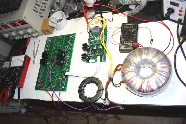 You can test the output pins of the IR2110 chips on the low side with an Oscilliscope. One chip will give a square wave output, the other is the sinewave pulse width modulation. To do this you need to put your probe on and turn on the 8010 chip, you only have a few seconds before it will shut down due to no voltage feedback. You can connect the 12v on the board to the positive side of the output of the diodes to fool it into running constantly, it may require some adjustment of the VFB pot to get the right voltage level. Then you can test the control board and power board by leaving the capacitors off the power board and put a couple 10-ohm resistors in series with the 48V input you can run the power board without risk of blowing the MOSFETs. Once you have established you are getting a decent smooth sinewave and low idle current from the transformer you can then shut it down and add capacitors. Then you can finish assembling everything and everything should be fine. There are only 10 types of people in the world: those who understand binary, and those who don't. |