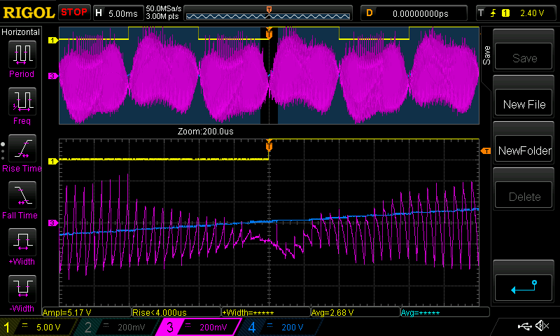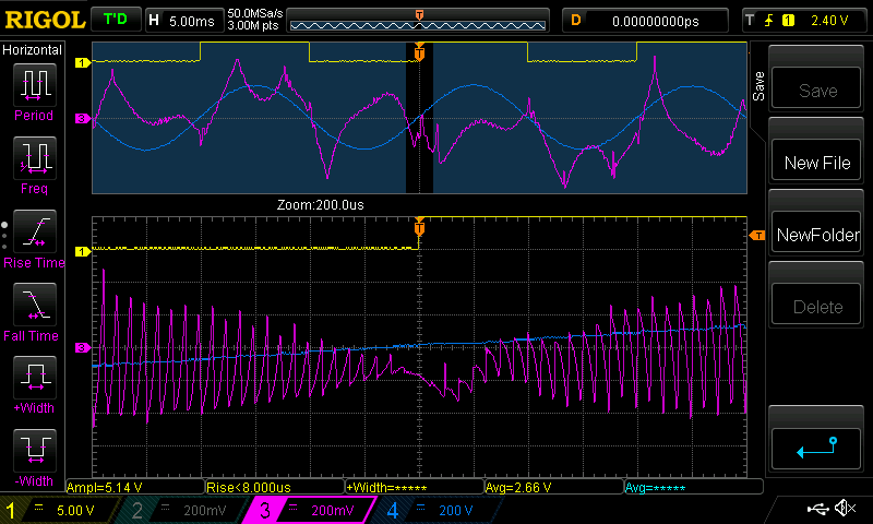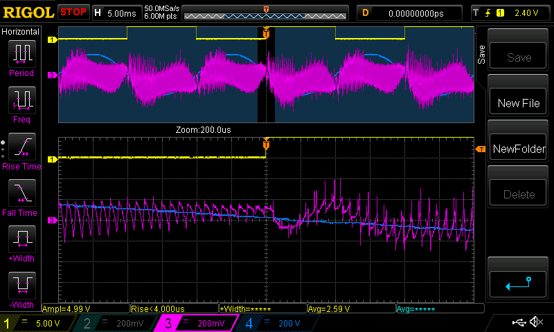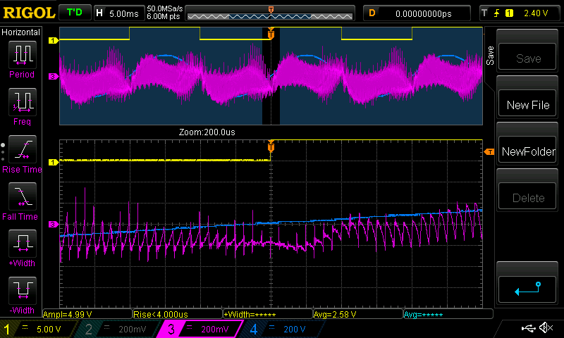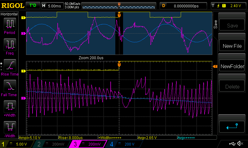 Wiseguy, I have tested the perfect symmetrical output today. First I had to alter the test inverter to make it give a bit of noise. Changed the 100uH choke to a 22 uH with no change to the cap. Now the 1.5kW toroid makes a nice amount of noise at idle. The original firmware, that has the few pulses in the wrong places uses 0.34 A at idle with a 51.4V supply Running the new firmware, there is no noise and the same idle current. AS usual, the DSO is educational. Yellow is 50 Hz sync pulse Dark Blue is AC output voltage Purple is primary winding current. (about 1 Amp/div) Old firmware: ![]() The new code with nice symmetrical pulse train: ![]() First, I average 4 triggered captures to reduce noise so the top current traces look weird. Second, I triggered on different zero crossing for the 2 versions of code. One when rising, one when falling. It does not matter. The key thing to see here is to compare the two bottom traces of the current. In the center is the zero voltage crossing and we can see with the old code a bump of current is produced right after zero volts. With the symmetrical code, there is no bump. I think this means it's as good as it can get. IF you look closely, using your good eye, I think we can see evidence of oscillation excited by the bump of current that is injected at zero crossing. I see the first, large bump, then I see it faintly echoed afterwards. The period is about 2 divisions so that's 400uS. This is a frequency of 2,500 Hz and we all should be able to hear that. This is quickly damped though, so we hear it started up for a few cycles each time the voltage crosses zero. Here is the symmetrical code, without trace averaging, to show what the primary current is really doing during the 50Hz waveform. I do not like potentially misleading people. ![]() I replaced the 100uH choke, to see if it's the same. It's the same, but with 1/4 of the current so the Purple trace is 1/4 the height. old code: ![]() new code: ![]() When running with the new code and the 100uH choke, the torid is silent. This is very dangerous for me since there is no audible warning the inverter is running. It's so quiet now... Here I show the symmetrical code under a light load, 100W. ![]() wronger than a phone book full of wrong phone numbers |