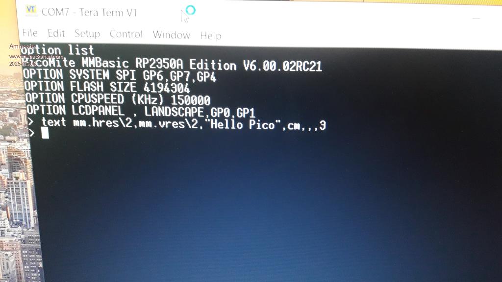 V6.00.02RC23 is available on https://geoffg.net/Downloads/picomite/PicoMite_Beta.zip Fixes editor showing a hidden line when editing a file loaded from disk with continuation lines enabled Changes AUTOSAVE command to circumvent a caching issue when PSRAM is enabled Checks incoming line length in AUTOSAVE and aborts the load if a line exceeds 255 characters Implements driver for ST7796S based 4-wire SPI displays. See here |