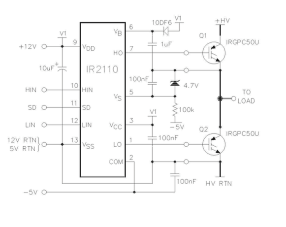 and uses those outputs as inputs for a pair of IR2110 ICs.