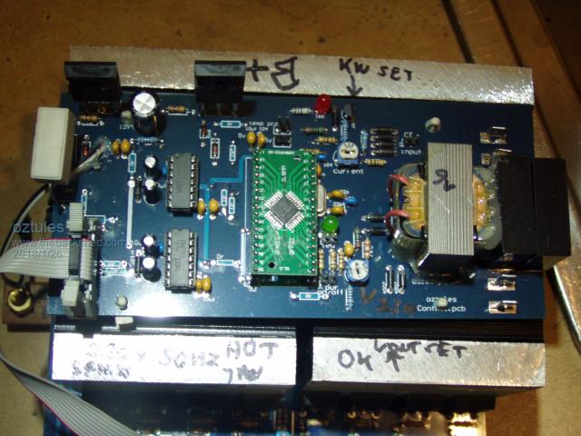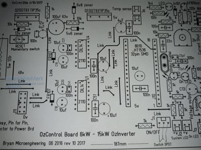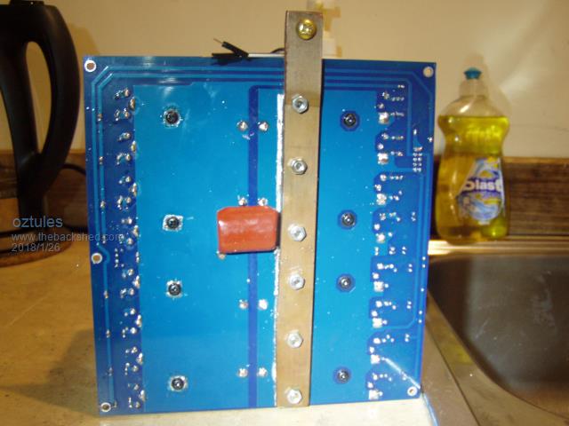 crappy pic I know The four on the left in a straight line are electro. All the other caps ( but for the 100uf) I use ceramics. tip... do the lowest components first ( resistors, diodes etc ).. then caps, then 8010 etc. Makes it much easier to do....oh, and make sure there is clearance for the crystal above the board ( say 1mm air gap ) This is my normal unit complete with 16 hy4008. It easily does 14kw and more for start up of 5hp motors..... don't know how many I have made, but they all work out of the box... plug and play. One neighbor who has one as a back up for the grid system here ( flaky) told me the other day he was running the house with it ie hot water on, fridges and freezers and air conditioner, etc etc, and was welding some stuff up for a sizable project... thinking all long the welder was on the grid circuit, only to find the whole lot was running off one of these things... he is a true believer now.... before he thought they were beaut, now he thinks they are legendary. ....oztules edit this is clearer.... just And this is how I do the neg installation... I use a 1/8" copper bar ( 20mm wide ), and sweat it onto the board, and then screw it as well. Makes the board easy to install.... 4 bolt points for the cables, and a few plugs to the top board. Village idiot...or... just another hack out of his depth |