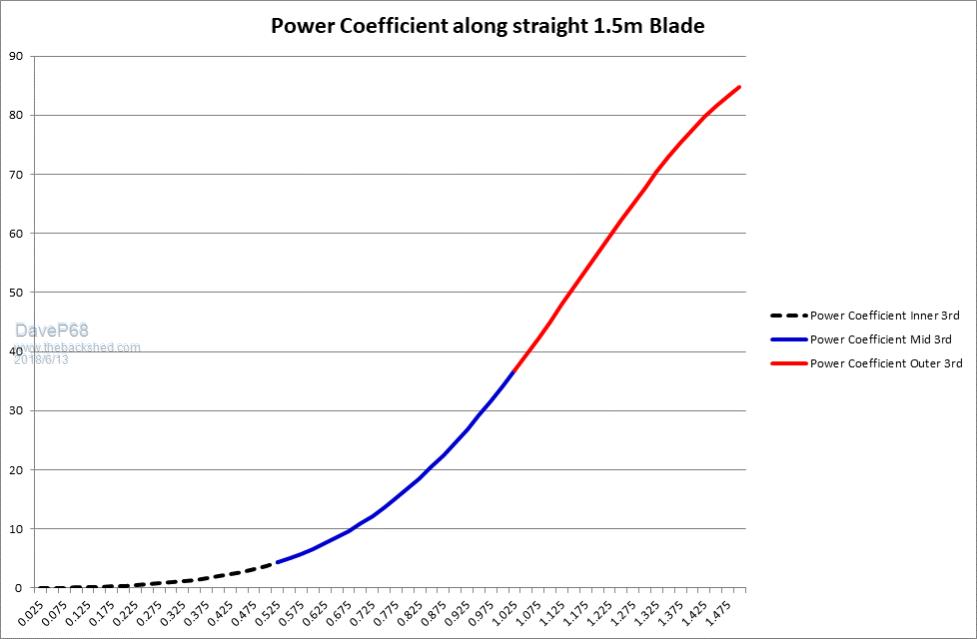 Here's my 5 cents worth on using blades with a straight leading edge with no twist. Yes Madness is 100 % correct here. To illustrate this in a visual manner I've made some graphs. First up shows the outer part of the Blades swept area and it's not to scale. ![]() A graph of 60 points along a 1.5 m blade at 25 mm intervals showing how much power is produced at each interval if total power on the shaft is 1000 W. ![]() A Bar graph showing the power output percentage of each 0.5 m section along the 1.5 m blade from inner to outer. ![]() So as can be seen the inner 0.5 m section of blade is producing only 1.4% of the total power. The middle 0.5 m section is 20.3% which is still significant. The outer 0.5 meter section is producing a whopping 78.3 % of the total. Took a bit to crunch the numbers on this and I'm confident that they are close to what is happening in real world conditions. This data endorses the amazing performance of the GOE 222 aluminium blade profile. On a separate note for James, here is some info published by NASA on Aerofoils. ![]() The trick is to try and profile the outer half of the PVC blades to follow a profile close to what's shown above. This may require a small reduction in the Chord line. Hope this helps to clarify how one type of blade works on small wind turbines. There are realities if you do not accept, will lead to frustration because you will be spending time on wrong assumptions and the results cannot follow! The Dunning Kruger Effect :) |
