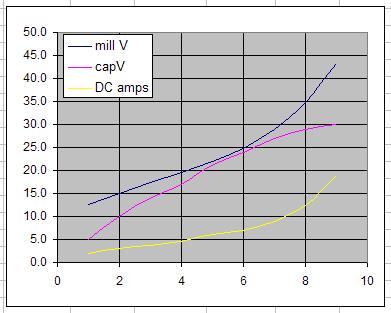 I give in Gordon, Why did you calculate the ac rms as phase voltage /1.73, if the machine is in delta?... for star I get it. I would have expected the delta phase voltage to be just the rms between phases. The total output current (AC RMS ) would have to halved though to see the AC RMS current in a single phase. However, as you measured a single phase only it should be correct.... but the voltage has me ? This would bring say the first reading up to 21v AC RMS X 1.414 = 31v DC... just over cut in volts... which makes sense to me. ( the sine wave looks good enough for 1.414) I'm lost again