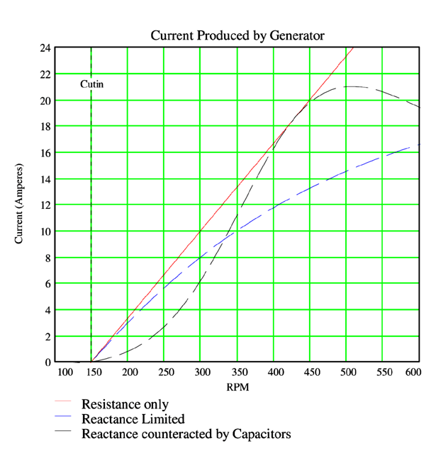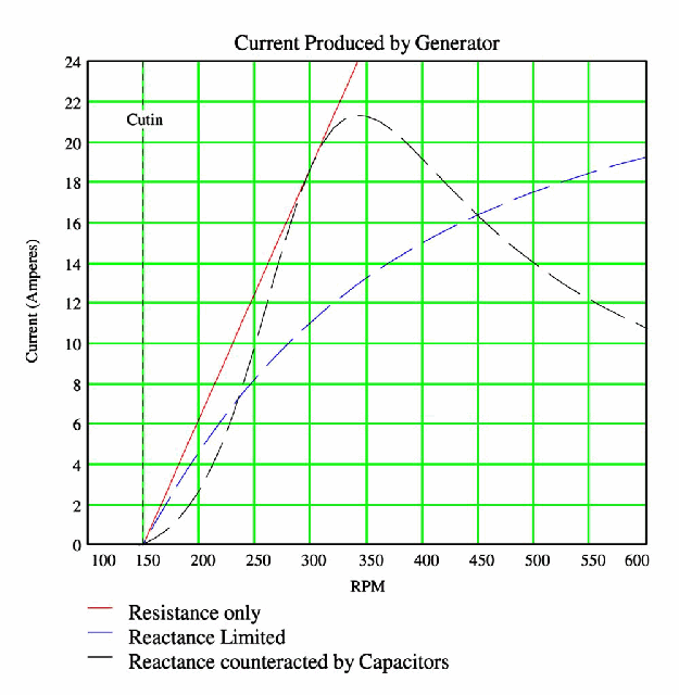 Yesterday I took some measurements that may be of interest in the discussion. My multimeter, "Meterman/ Amprobe 37XR" can measure inductance of a coil. Among the motors I've collected and converted, there is a Baldor 3-phase motor that I experimented on in the spring. I used the rotor from a different motor, temporarily installed magnets on it, and inserted it in the Baldor to do some tests. What I have is a 3-phase, 4 pole, 3hp motor with star connections, upon which I can measure phase inductance with no rotor, with the stock rotor, or with a rotor arrayed with permanent magnets. Here is what I measured: No rotor: 15.7 mH Stock rotor: 65 mH Magnet rotor: 27.8 mH With these numbers, particularly the one from the magnetized rotor, I worked out the impedance of the unmodified circuit (in Star) and then found the capacitance required to compensate. I used a highly simplified windmill as the basis, where simple open-circuit voltage is divided by winding resistance to obtain the current. Below is a graph of the generator's output. The red line is pure resistance, it's the baseline and would give the highest current output. The blue line takes reactance into account, and the growing impedance effectively caps the output of the windmill as the speed goes up. This like what I see in my operational windmill. I cannot make the curve agree exactly with my windmill output, however, because its output increases linearly up to 500 RPM before it flattens out. The blue curve is close enough for the purpose of seeing what's going on, I hope. The black dashed line adds up the impedances of the inductance, resistance, and capacitance in series on the windmill output. The capacitor has something of a counter-productive effect at low RPM, but once the windmill gets going (and the capacitor is helping it get started, in fact) the output really does get optimized at 300 RPM in this example. The optimization is VERY sensitive to the capacitor value. The values used in this case are L=35mH, C=7200uF, R=1.6Ohm, E=0.2V/RPM, and f=1Hz/30RPM (4 poles)