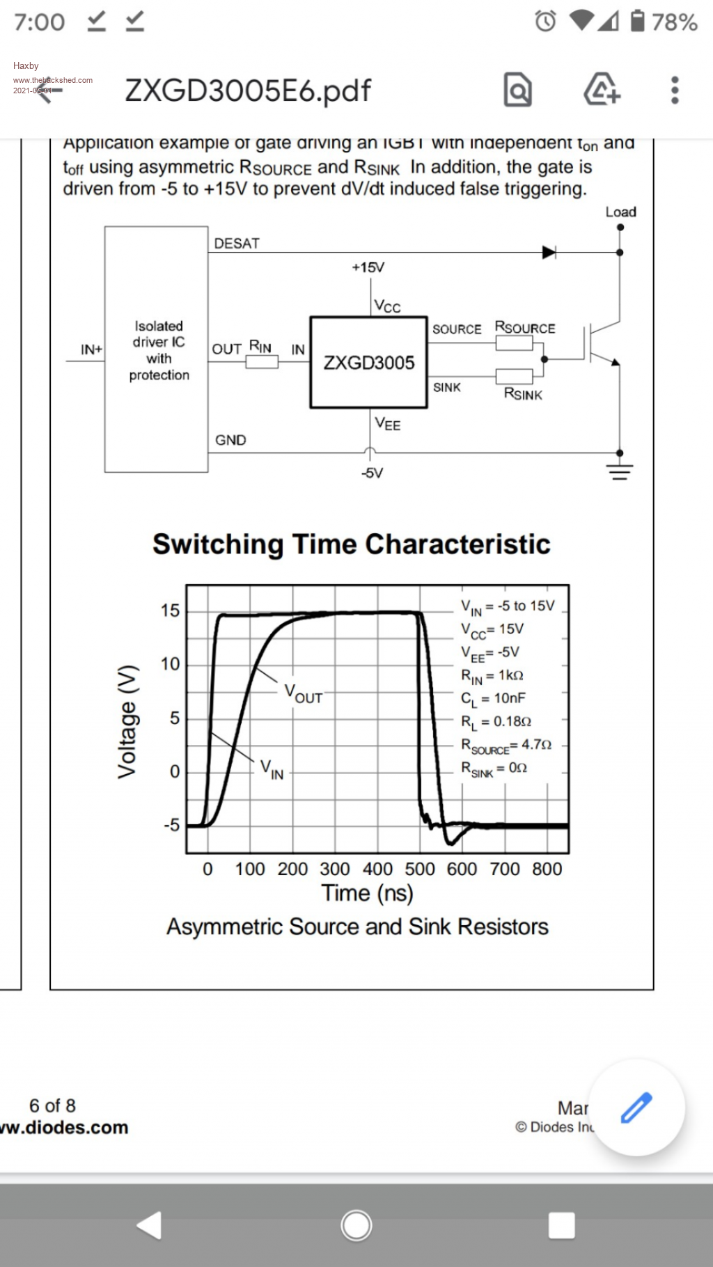 Peter, the negative bias and the ringing are totally unrelated topics. In my career if I ever took a short cut and put something in production prematurely it inevitably would come back and bite me in the ass. This has caused me to be very cautious, pessimistic and strive to get it right from the get go - almost to the point of obsession. When I made my inverter board Rev0 - that has exceeded my expectations to date - I had read hundreds of posts here and had a few odd arguments with others along the way and built my board the way I believed it would perform best and that meant not following a Mad/Oz style build (or thanks to you the dreaded EGS002) but going with my experience and intuition and drawing from all the good things I read that resonated with my thinking. I did say from the outset that I did not want to build an inverter power board that would interface to an oz/mad controller as I did not believe the approach was right or best and considered that I would have an existing Achilles heel if I did. The ringing that I found with each prototype I played with always responded and went away with a drain ferrite bead on the lower side FET's. But I had a totally different power stage. I used low impedance opto drivers with fast high current transistor buffers all on the same PCB avoiding the dreaded ribbon cable fiasco. All gates drives had a 2R2 and around 80mm of total track length. I use a ribbon cable that carries opto drives in inverse parallel and I have isolated optos & power supplies the only common connection is ground which was only needed for measuring the input voltage. So when I see an issue like the gate bounce I observed, I think maybe I should pull my head in and just be an observer. We are fighting two different animals in the end. You might build a hundred the way they are and they will all work properly on the other hand......I dont profess to know that answer only time will tell. There is no argument that it works but perhaps there is not a large enough sample to draw all the right conclusions from yet. I did not mean to say it was shoot through only that it was headed that way and how much space was there till it became shoot through. If it (gate bounce) could be lessened surely it would only be a positive result ? Edited 2021-05-01 17:31 by wiseguy If at first you dont succeed, I suggest you avoid sky diving.... Cheers Mike |