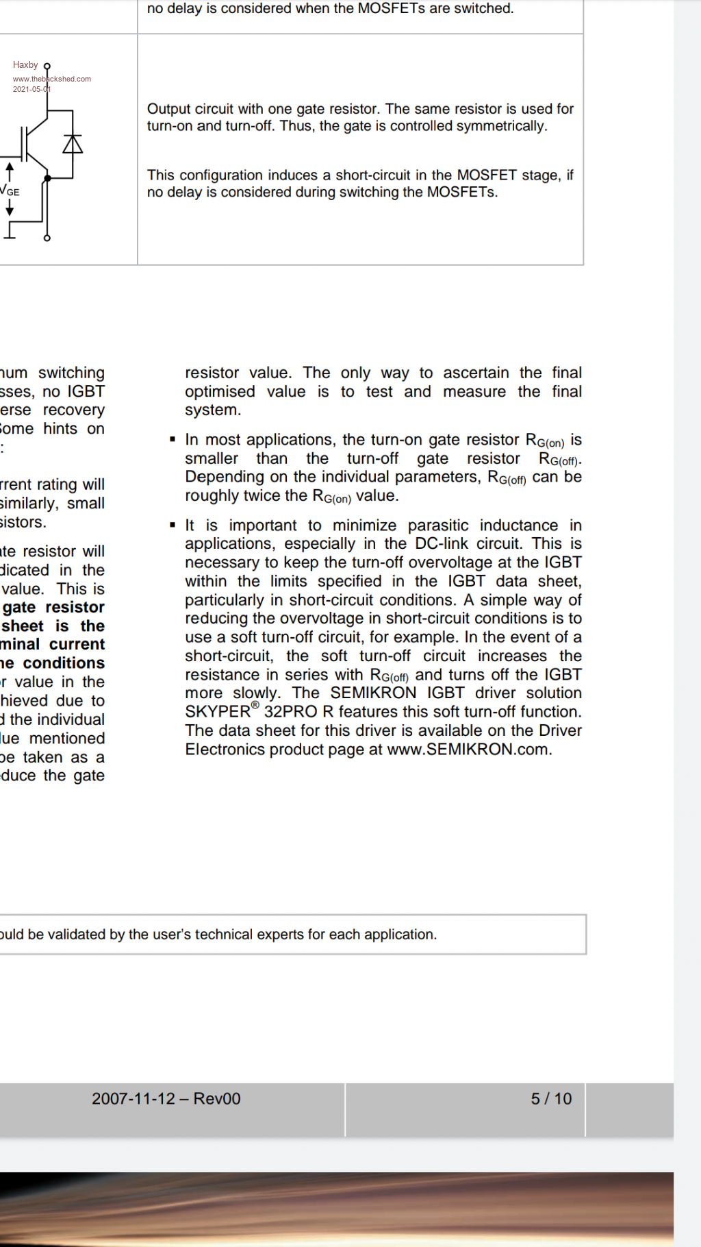 Haxby, I couldn't do a better job describing IGBT's than these 2 application notes I will link to: App note 1) Infineon-EiceDRIVER-Gate_resistor_for_power_devices-AN-v01_00-EN.pdf App Note 2) AN-7003_Gate_Resistor-Principles_and_Applications_rev00.pdf Warp and Solar Mike have a lot more experience with IGBT's so I would rely on their help and the App notes to find your solution. As you will see from the App notes larger gate resistors than MOSFET's use are common. The problem and solutions we are discussing here are less relevant than with IGBTs they are a bit different when it comes to problems, causes and solutions. Edited 2021-05-01 16:56 by wiseguy If at first you dont succeed, I suggest you avoid sky diving.... Cheers Mike |