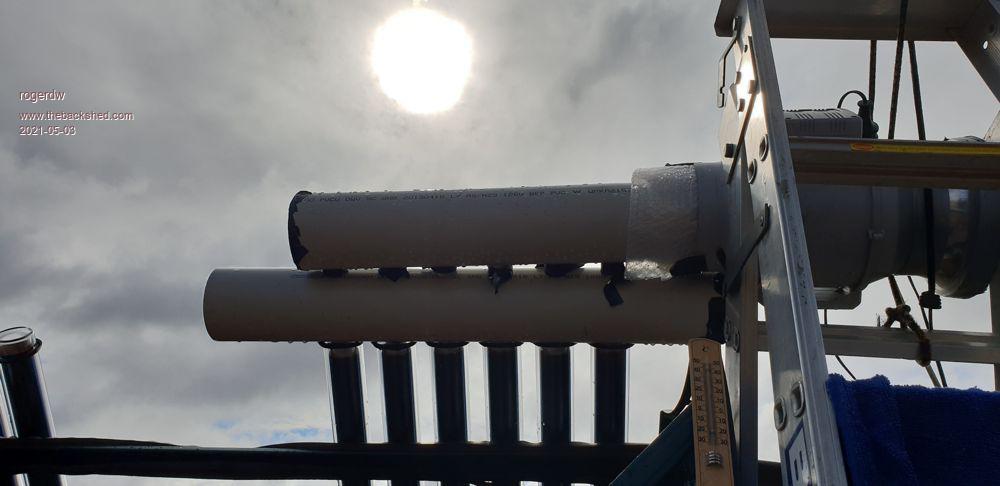 The whole thing needs to be totally enclosed by your pipe somehow, so all of the heat is transferred to the moving air. None of your heater should be exposed directly to outside air. Thanks Tony, I get it now. It was the fully enclosed part that had me wondering. I had often thought of collecting some of these, as much for the motor and fan as anything ... but I'll check out the dump shop etc. That is exactly right. At 8.45 this morning ambient was 10.6... all overcast and mostly cloud again. I fired it up and it crept up to 16.6 ... and I actually noted "feels warm compared to ambient" I think you're correct there too. I probably do need a solar panel leaning against the frame as well and take corresponding readings along with mine. I think I had the wrong idea about these tubes and the heat collection because of my early testing. Early on I just had them lying in the sun and was measuring the temperature inside from time to time ... and they seemed very slow to drop after building up. On top of that, if I did blow air into them, it took say 5 minutes to get the temperature down a reasonable amount. Now though, that I have them with a constant airflow through them ... I can see an almost instant change in temperature in relation to sun exposure. Just this morning with the cloud breaking up and the sun coming and going constantly ... I've seen a high of 30.4 and then a low of 24.2 over just 2 minutes. It follows very closely the amount of sun shining (as you would expect). Having said that, if I allow the heat to build up inside the tubes and then turn on the fan ... there seems to be a buildup of heat that takes several minutes to disperse before the temperature drops down again to a level consistant with the actual amount of sunlight on the array. Cheers, Roger |