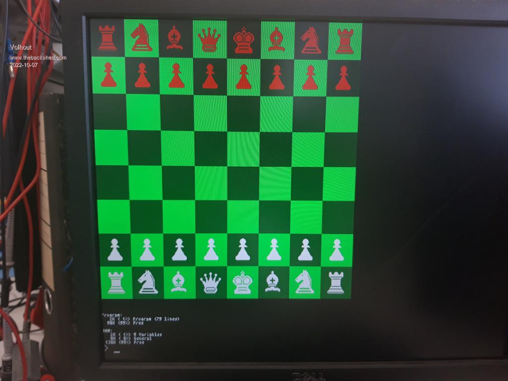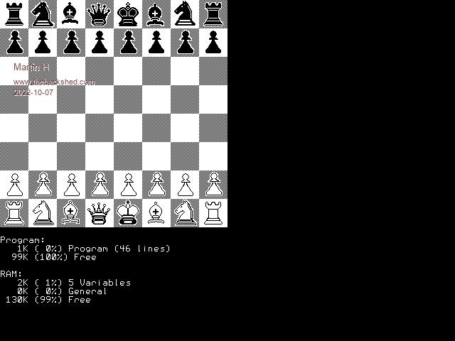 Remember you can also use colour in mode 1 using the tile command. If each square on the chess board was 48x48 then your board would be 384x384. Within each square you can have individual foreground and background colours allowing the "black and white" squares and "black and white" pieces each to have different colours |