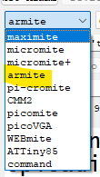 I thought I had changed that. Must have done it early before the meds kicked in... With MMCC shut down, edit MMCC.inf about line 130. There is a section [Device types] Look for the culprit and change it to ARMmite. Usually Type3 Save and restart MMCC. You will have to reselect device types for any saved favorites. [Device types] Auto-configure device type = 1 ; FamilyList\ Fname|autostart|autoend|autoName|drives|xmName|filesCMD|filesAll|flash|fnstart Type0 = maximite|auto|\003|0|2|2|files|0|0|0|0 Type1 = micromite|autosave|\026|0|0|1||0|1|0|0 Type2 = micromite+|autosave|\026|0|1|3|files|0|1|0|0 Type3 = ARMmite|autosave|\026|0|1|3|files|0|1|0|13 Type4 = pi-cromite|autosave|\003|0|1|1|files|0|1|0|0 Type5 = CMM2|autosave|\027[12~|1|1|3|ls|0|1|0|30 Type6 = picomite|autosave|\026|0|2|1|files|0|1|1|30 Type7 = picoVGA|autosave|\026|0|2|1|files|0|1|1|30 Type8 = WEBmite|autosave|\026|0|2|1|files|0|1|1|30 Type9 = ATTiny85|||0|0|0||0|0|0|0 Type10 = command|||0|1|0|files|0|1|0|0 Jim VK7JH MMedit |