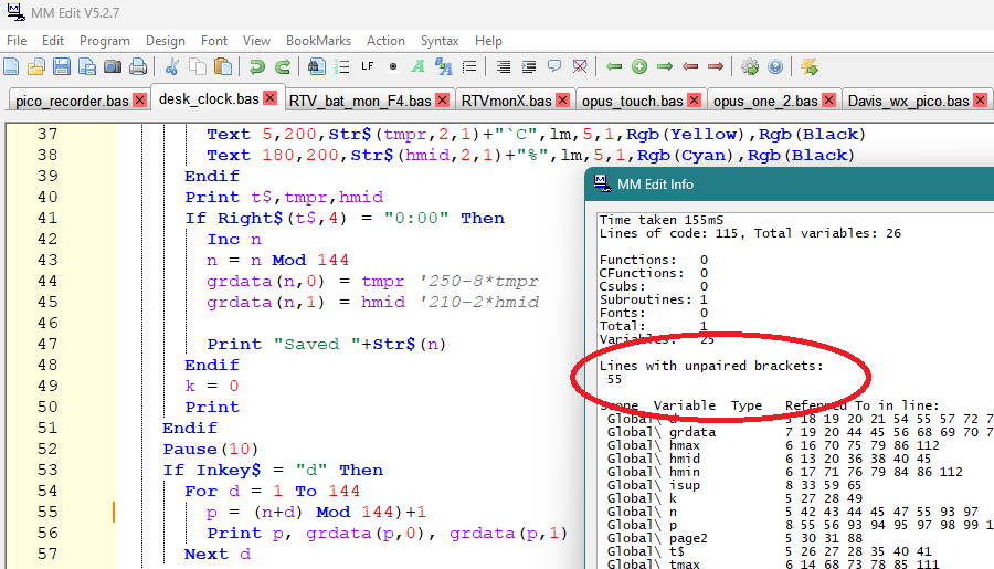 Jim, There is so much coding help in MMEdit. But the most common remaining error I see when developing code on MMEdit is a mismatch in opening and closing brackets. Which is then detected at runtime. Is this something for a future release of MMEdit ? Just counting opening and closing brackets, and identifying a mismatch ? Regards, Volhout PicomiteVGA PETSCII ROBOTS |