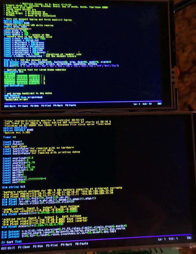 Hi Peter, Further testing this morning, the double page scroll while listing a file only happens when you use the USB keyboards, it's as though there is key bounce, in fact, if I have both a USB keyboard and a terminal connected together and I start the listing from the terminal, works great every time, but if I then start to use the USB keyboard to "Press any key" I get 2 screens worth, go back to terminal all good, all in the same listing of a file. I have also now tested using 2 different USB keyboards, one wireless and one wired. Options, I think my touch is broken on the screen. PicoMite MMBasic USB Edition 5.09.00b7 OPTION SERIAL CONSOLE COM2,GP8,GP9 OPTION SYSTEM SPI GP18,GP19,GP16 OPTION AUTORUN 1 OPTION COLOURCODE ON OPTION KEYBOARD UK, 0, 0, 200, 100 OPTION PICO OFF OPTION CPUSPEED 252000 'KHz OPTION LCDPANEL CONSOLE ,,,,,NOSCROLL OPTION DISPLAY 26, 60 OPTION LCDPANEL ILI9481, LANDSCAPE,GP15,GP14,GP13 OPTION TOUCH GP12,GP11 GUI CALIBRATE 0, 3948, 4090, -1300, 9223372036854775807 OPTION SDCARD GP22 OPTION KEYBOARD REPEAT 200,100 Code being listed. 2multiclock480x320.BAS.zip You said a while back, that a LCD that is 480x320 would not be able to have both a Frame buffer and a Layer buffer, because of memory limitations. Is there a way of effectively forcing a smaller Frame/Layer buffer, along with only updating a smaller portion of the LCD, to simulate using say a 240x320 screen? for debugging and testing purposes on a larger screen, so while at command prompt/editing full size, then the program can request a smaller screen/buffer? I realise this could be almost impossible? Regards, Kevin. Edited 2024-03-20 20:41 by Bleep |