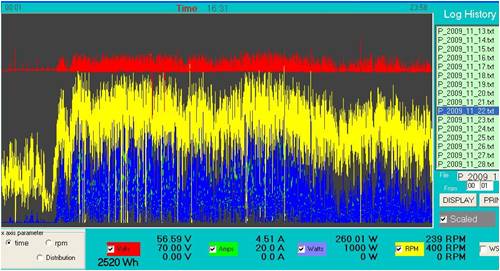 When you are flying blind, programming, as I am, You don't always get things done. It is easy to plot a graph, but there is 10 times more coding to plot the grid lines. I am not even going to try and describe what needs to be done to add text to axis etc. I think I could do it but why bother. All the information about the scaling maximums is on the same page. The graph is selected to be displayed as rpm on the x-axis vs power on the y-axis. On my other graphs, I use colour to identify the graphs. Any graph trace on the time based plot can be turned ON or OFF, and the power vs rpm, or power vs windspeed, there is only one plot. I can possibly see that this program is going to be a bit much for many readers. I cannot really make it simpler, as it would then not be a very useful tool.