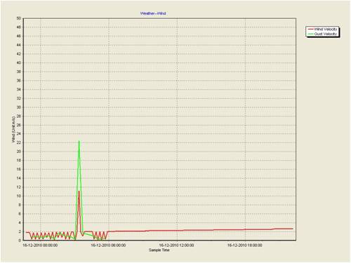 This is a capture of the front coming through today, disregard the reading to the right of the frontal peak as the memory filled up and as a result it didn't catch the second front later in the day. Mill survived OK so far even not furling properly.