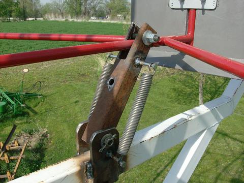 Everyone, I made up two parking arm assemblies and welded them inplace this afternoon. I've taken the rope off. As you can see in the picture, take out th top bolt and then piviot the arm inward and down and it will rest there until needed again. Its Spring loaded so it does'nt rattle around in the wind. Its made out of 3/8ths.x4 inch plate, and 2"x2" heavy wall sq. tubeing. Welded with 6010 root pass, 7018 middle and top passes.DC-. Maybe tomorrow I'll be able to get to the "break system". .....Mac46 I'm just a farmer |