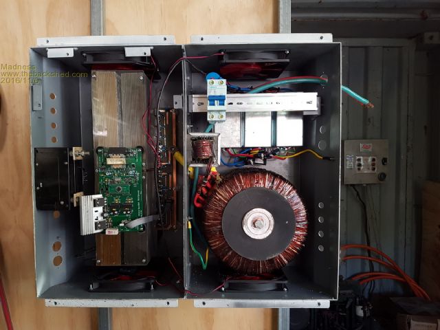 The Inverter is now on the wall, I figured it will be far easier to assemble it from here that way as there is no way I could lift it when finished. ![]() The major parts are now in place, top right is 3 filters from output of Aero-sharps. There is a perspex panel to go on the top left that will have screen and buttons for Arduino based monitoring system I am working on as well. It will control fans as well as data logging temperatures, current and voltages, this will be accessible via ethernet and display current information on a 3.5" TFT LCD with touch screen. Big problem I have though is bad wave-form as shown below, something wrong the timing, have tried 3 different power board layouts, get the same result with all of them.I am going to try ordering components locally for the control board to see if that rectifies this. Images are with no load, adding up to 2.4 makes the wave blurred and lots os of squiggles in it, the toroid and choke make lots of horrible noises when this happens also. These are from the the 2 sides of the secondary output. There are only 10 types of people in the world: those who understand binary, and those who don't. |